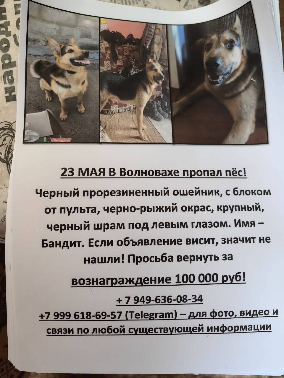 Знаменитый пес по кличке Бандит пропал в Волновахе 23 мая. Его взял с собой в зону СВО легендарный морпех, снайпер Ярый.