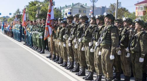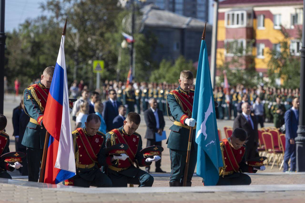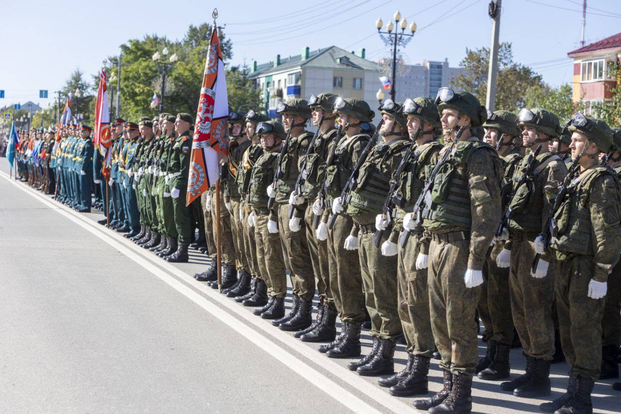 На площади Славы прошло возложение цветов к Вечному огню и торжественное шествие. Парадные расчёты сформировали из военнослужащих армейского корпуса ВВО.