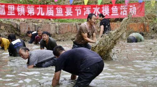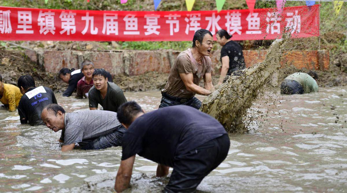 День рыбака жители китайского Пиаоли отметили городским пиром и ловлей рыбы в мутной воде