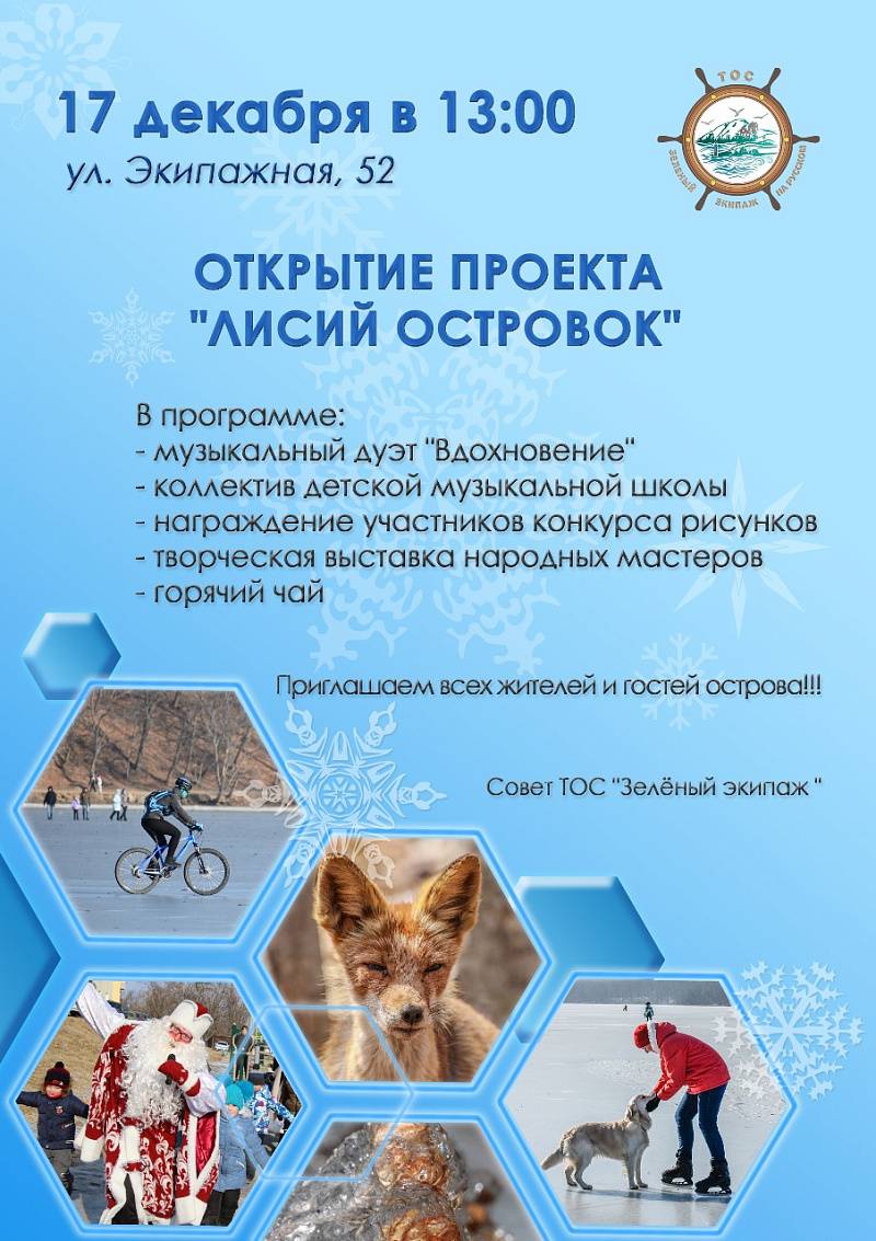 В воскресенье, 17 декабря, на острове Русский состоится открытие «Лисьего островка». Теперь скульптурная композиция «Лиса» и тематически оформленная остановка стали своеобразным туристическим кодом на острове Русский. ТОС «Зелёный экипаж на Русском» завершил свой креативный проект и всех приглашает на его презентацию, сообщают «Вести:Приморье».