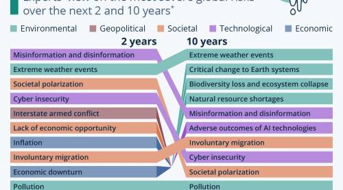 На втором месте списка рисков ВЭФ в двухгодичной перспективе оказались экстремальные погодные явления. За ними следуют социальная поляризация, угрозы кибербезопасности, а также вооруженные конфликты между государствами. В десятилетней перспективе опрошенные ВЭФ эксперты посчитали главными рисками мирового масштаба экстремальные погодные явления, критические изменения в системах Земли, а также сокращение биоразнообразия и разрушение экосистем.