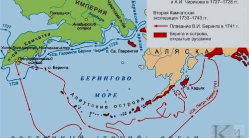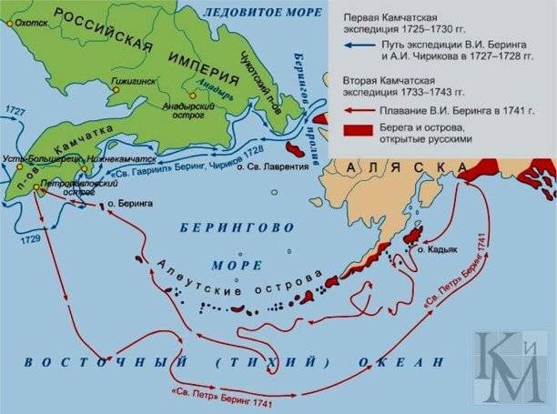 В сентябре 1740 года команда Беринга (1-й тихоокеанский отряд) отплыла из Охотска на Камчатку и зазимовала у Авачинской губы в гавани, назван. Петропавловской по 2 судам отряда – «Св. Петр» и «Св. Павел», там же основан острог Петропавловск. Лишь спустя 8 лет после отъезда из С.-Петербурга, 4 июня 1741 года корабли под командованием Беринга и Чирикова отправились к берегам Америки. Суда направились на юго-восток в поисках «Земли Жуана да-Гамы», помещавшейся на некоторых картах XVIII в. между 46° и 50° северной широты. Потеряв больше недели и убедившись в отсутствии суши в северной части Тихого океана, оба корабля взяли курс на северо-восток.