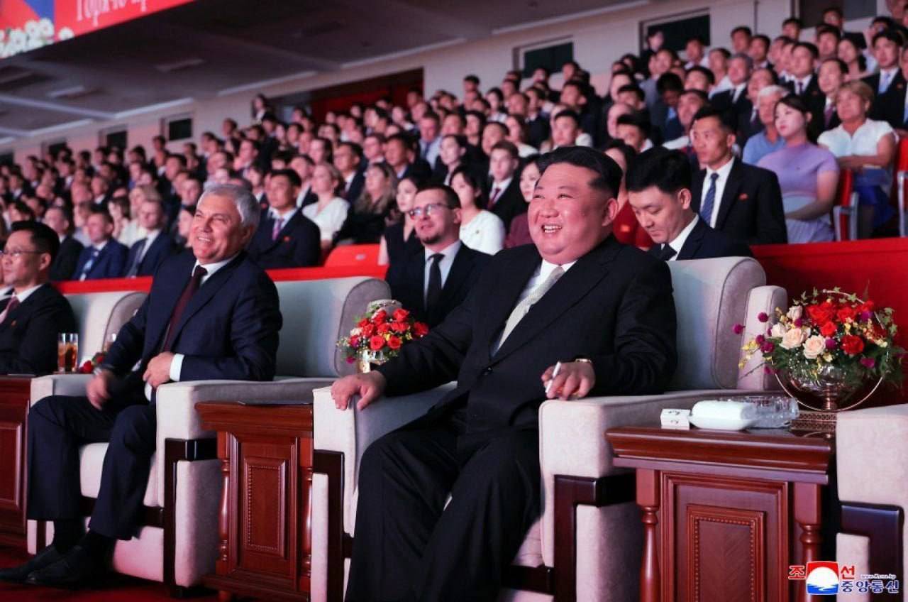 В интернет-сети уже появились кадры с выступления Ярослава Дронова в Северной Корее в огромном концертном зале, где в качестве почетных гостей находятся Ким Чен Ын и Вячеслав Володин.