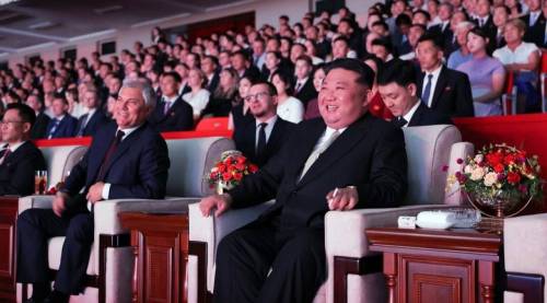 Концерт в Пхеньяне прошел в честь 80-летия освобождения Корейского полуострова от японского господства. На песне «Встанем» зал глава Северной Кореи аплодировали стоя.