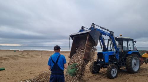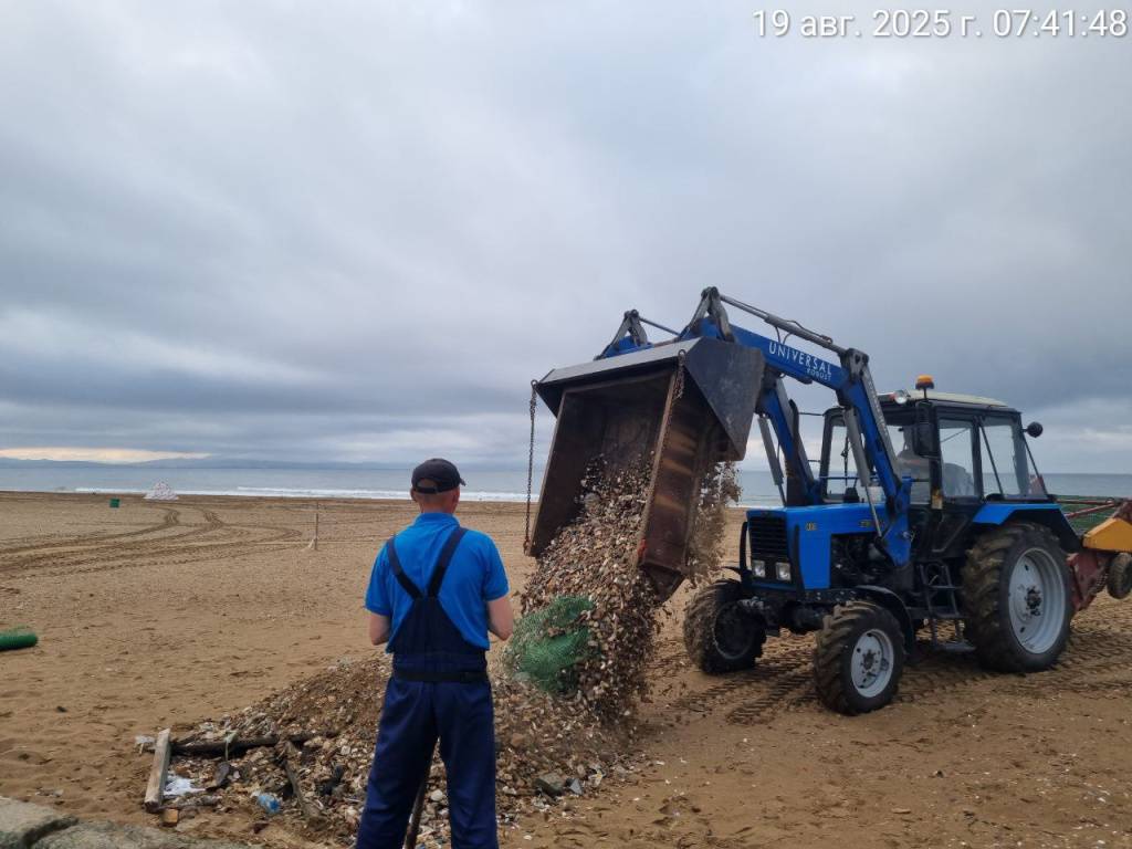 С раннего утра сотрудники предприятия начали работу по улучшению состояния пляжа. Используя специализированную технику, они просеивают песок, удаляя из него мусор, мелкие камни и ракушки. Одновременно ведется ручная сборка крупного мусора и скопившихся водорослей.