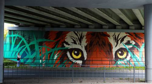 Еще одно произведение искусства украсило стену под надземным переходом на улице Олега Кошевого. Здесь огромные глаза амурского тигра и дальневосточного леопарда устремлены навстречу друг другу. Оба хищника замерли в ожидании, пристально наблюдая друг за другом взглядом, окрашенным в голубой и желтый цвета. Эта композиция стала частью конкурса муралов, инициированного администрацией Владивостока.