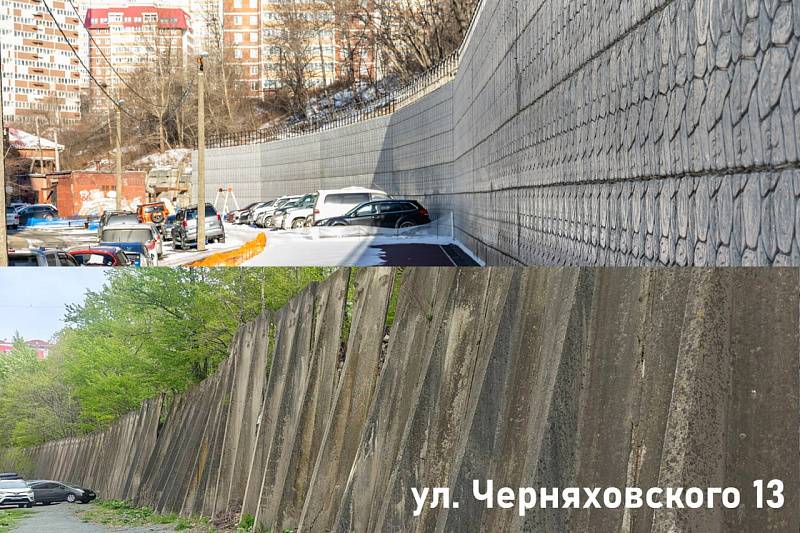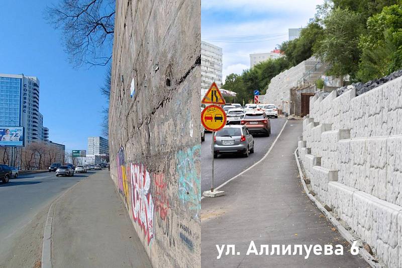 В рамках нынешнего строительного сезона произведено восстановление подпорных стен по таким адресам: Аллилуева, 6, Кирова, 13, Сабанеева, 18, Калинина, 279а, Котельникова, 2, Адмирала Кузнецова, 56а, 66а и 52, Суханова, 8д, Шкипера Гека, 15/1, Партизанский проспект, 2-12 и 24, а также Океанский проспект, 30, Ватутина, 12 и 20, переулок Павленко, Суханова, 4б, Карла Либкнехта, 10а и Карбышева, 54.