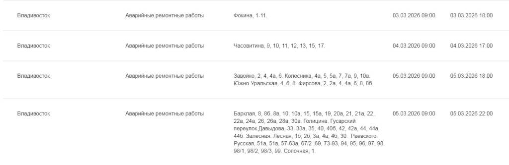 3-5 марта во Владивостоке в связи с аварийными работами пройдут локальные отключения холодного водоснабжения, сообщает сайт "Примвода"