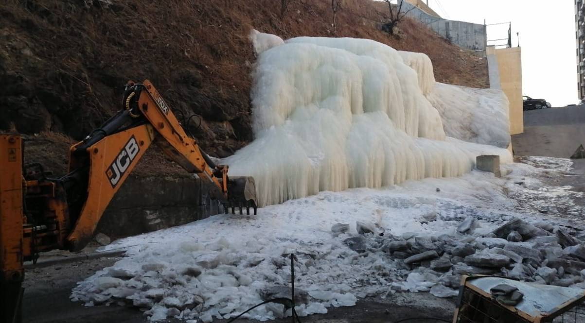 Дорожные службы борются с «ледяным водопадом» на Орлиной сопке, сообщают «Вести:Приморье».