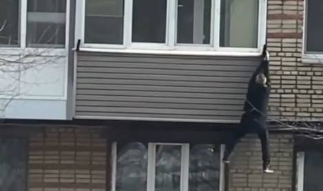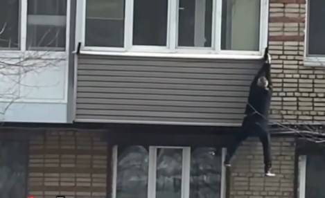 Сначала он залез на козырек подъезда, оттуда по проводам, держась за подоконник окна, дошел до балкона. Здесь, едва не сорвавшись и повиснув на опорах, которые используют для сушки белья, парень завис, но смог опереться ногами за раму окна. Затем, показывая физическую подготовку, подтянулся и перемахнул на балкон. На кадрах видно, из кармана выпало что-то похожее на банку. За представлением наблюдали очевидцы. Они и сняли все на видео.