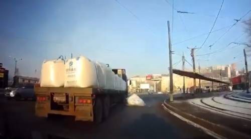 Во Владивостоке прямо во время движения на дорогу вывалился огромный мешок. На регистратор очевидца попала ситуация с улицы Луговой. Машина с прицепом, на котором был незакрепленный груз, двигалась в сторону площади. На повороте один из мешков слетел, упав на дорогу. Владельцу регистратора авто, который шел следом, удалось вовремя затормозить. На кадрах видно, как большегруз притормаживает, скорее всего, водитель заметил пропажу.