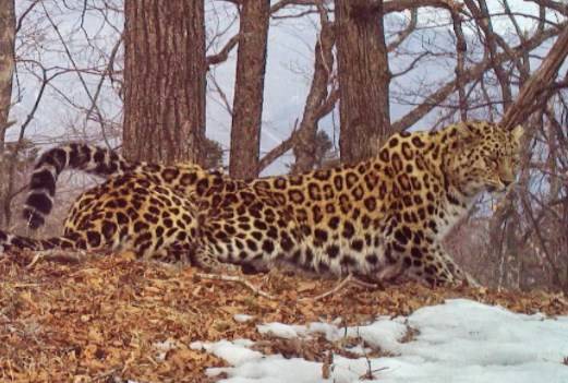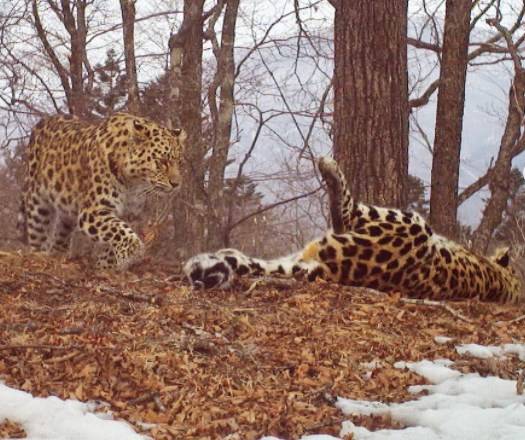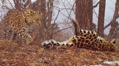 Редкие кадры из жизни краснокнижных дальневосточных леопардов в дикой природе! В преклонном 13-летнем возрасте большой кот устроил свидание – фотоловушка запечатлела встречу редчайших в мире леопардов и процесс спаривания, рассказали специалисты в инстаграм-аккаунте нацпарка «Земля леопарда».