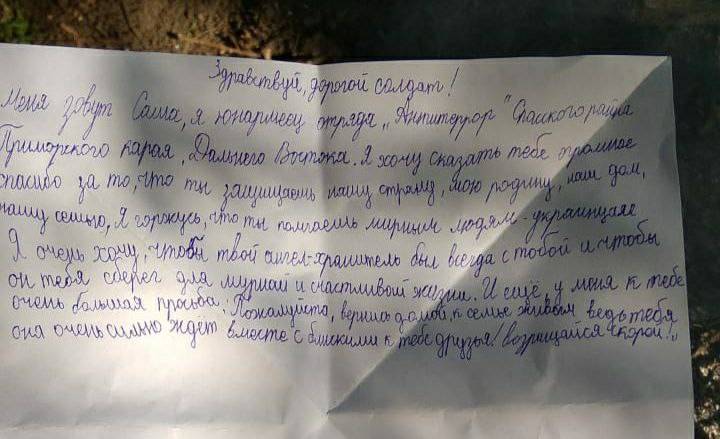 Военный обозреватель отмечает, что самое главное для тех, кто сейчас воюет с нацизмом на Украине - "это письма, которые губернатор края привозит во время каждого своего посещения позиций тихоокеанцев. В письмах приморские дети пишут тёплые послания воинам, ведущим борьбу с нацизмом. Мой дружище получил письмо из Спасска-Дальнего, и по возвращению из командировки намерен найти ребёнка, написавшего ему такие нужные слова".