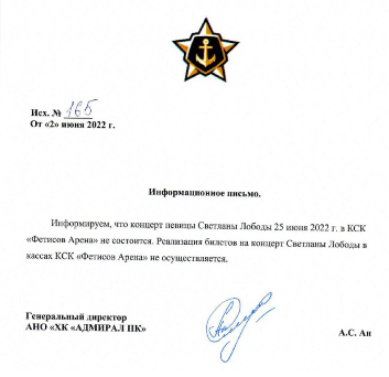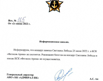 В документе говорится: "информируем, что концерт певицы Светланы Лободы 25 июня 2022 года в КСК "Фетисов Арена" не состоится. Реализация билетов на концерт Светланы Лободы в кассах КСК "Фетисов Арена" не осуществляется".