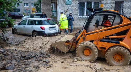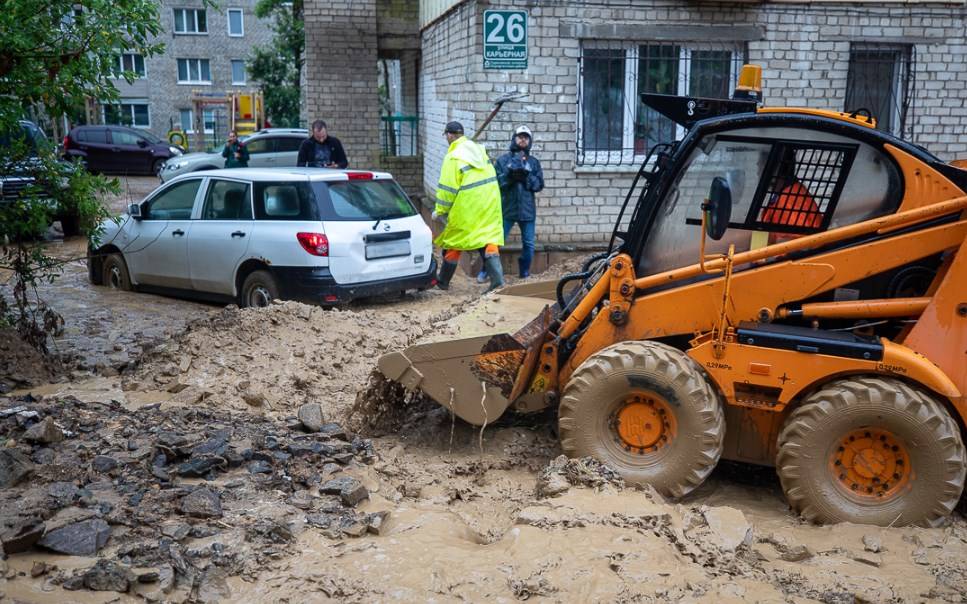 Аналогичная ситуация произошла здесь на прошлой неделе. Сегодня из-за обильного дождя потоки воды вышли на придомовую территорию. Она оказалась засыпанной грунтом и камнями. Для расчистки дорожная служба привлекла грейдеры, погрузчики и КамАЗы, пояснили в пресс-службе мэрии.