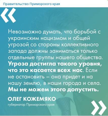 Губернатор Приморского края Олег Кожемяко поддержал решение Президента Владимира Путина о частичной мобилизации и считает решения, принятые и озвученные главой государства, исключительно важными, так как они направлены на поддержку Вооруженных сил России. Об этом говорит тг-канал администрации Приморского края.