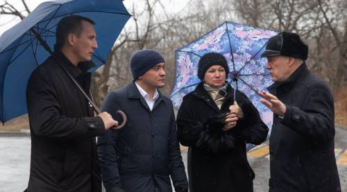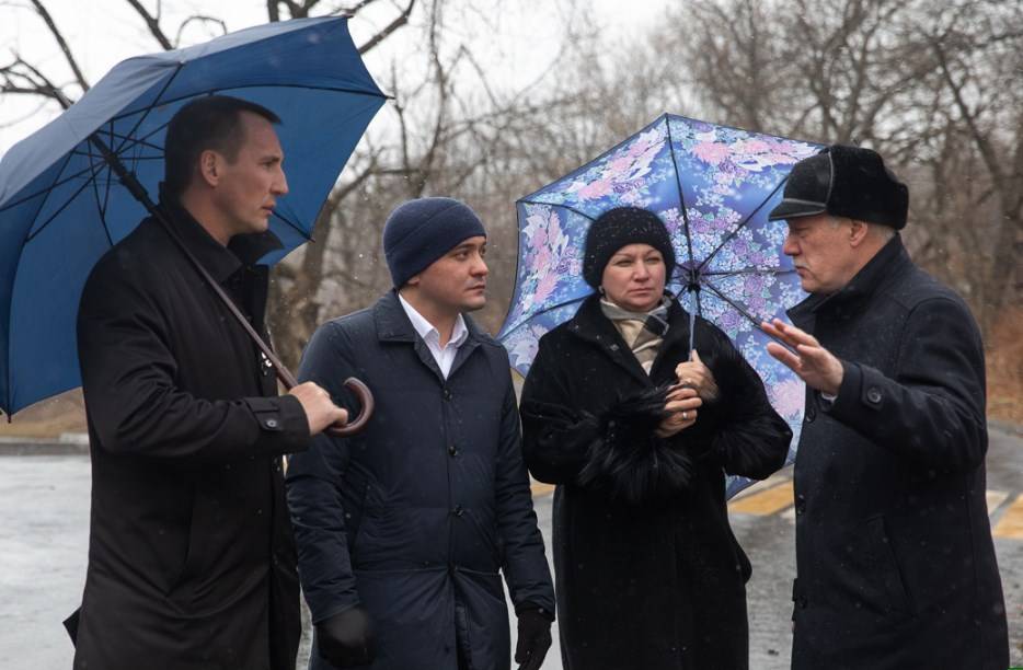 Ход строительных работ проинспектировали заместитель главы администрации Владивостока Тарас Фищук, председатель Думы Владивостока Андрей Брик и его заместитель Елена Новицкая.