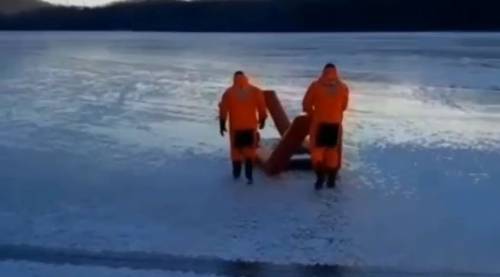 Выход на лёд сотрудникам водохранилища запрещен. Вызвал спасателей. Отряд прибыл со специальным плотом.