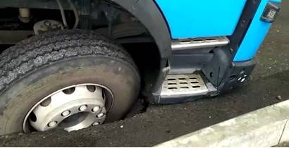 Проезд перекрыт: Бетономешалка «уходит под землю»