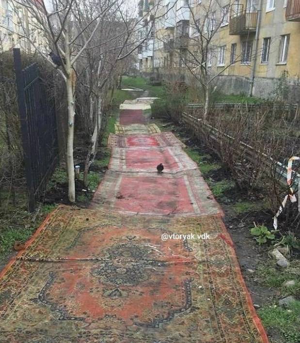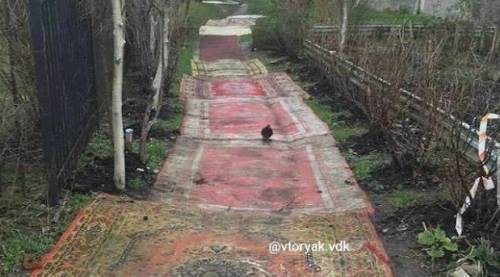 Так, на фото видно, как жители Владивостока решили проблему утилизации старых ковров. Вероятно, находчивые жители Второй Речки нашли способ, что можно устранить сразу две проблемы. Первая - избавление от старых и уже многим не нужных ковров, вторая - тропинка между домами превратилась, по мнению горожан, в «царскую дорогу».