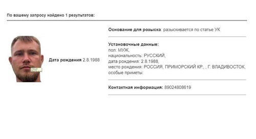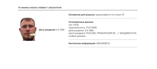 Ранее сообщалось, что МВД РФ объявило в розыск уроженца Владивостока 1988 года рождения Богданова.