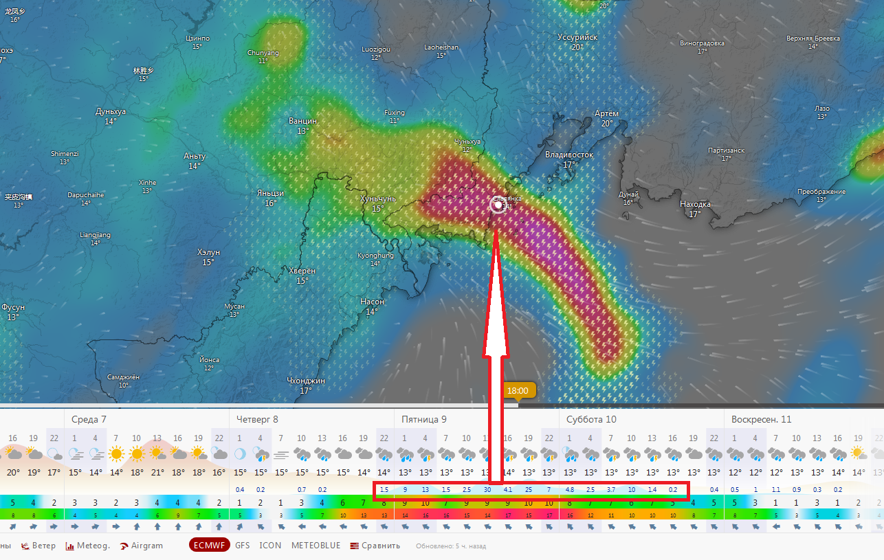 8-9 июня в Хасанском районе Приморья возможны сильные осадки, сообщают "Вести:Приморье" со ссылкой на windy.com.