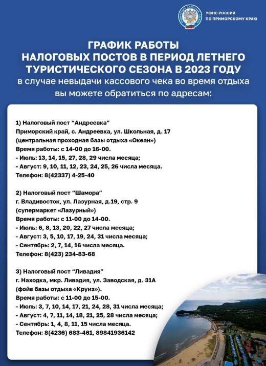 На сайте ФНС в Приморье отмечается, для того чтобы защитить права граждан и добросовестных налогоплательщиков, а также обеспечить исполнение субъектами предпринимательской деятельности порядка применения контрольно-кассовой техники (ККТ) при осуществлении расчётов, весь летний сезон в популярных местах отдыха в Приморье будут организованы налоговые посты.
