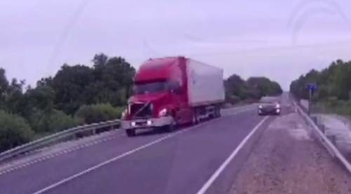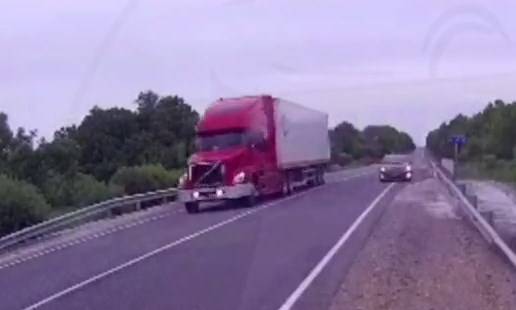 Инцидент на трассе с большегрузом и седаном попал в поле видеорегистратора очевидца, сообщают «Вести:Приморье».