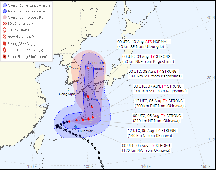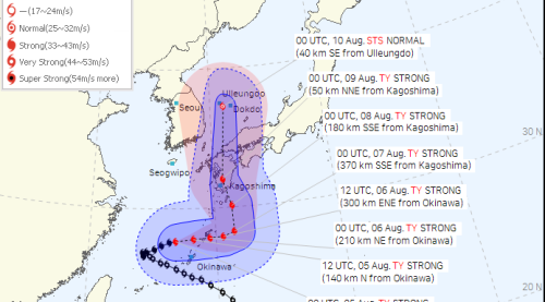 Прогноз windy.com подтверждается и данными метеослужбы республики Корея. Этот ресурс публикует траекторию (см. фото 2) движения супертайфуна Khanun, которая проходит в непосредственной близости от Владивостока.