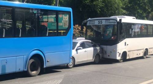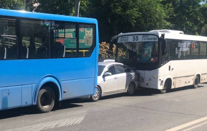 Во Владивостоке на Океанском проспекте седан оказался зажат между двумя пассажирскими автобусами, сообщают «Вести:Приморье».