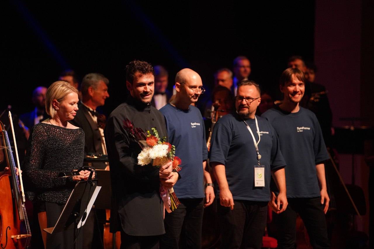 «Мы в Сбере уделяем очень большое внимания теме развития искусственного интеллекта. Это одно из самых фокусных, высокопотенциальных и высокоперспективных направлений. Мы использовали нашу нейросеть SymFormer, которой мы показали творение Петра Дранги: обучили ее на основе партитуры. Уникальность сегодняшнего события заключается в том, что нейросеть в режиме реального времени импровизировала на основе той информации, которую получила из партитуры», – рассказал главный эксперт по технологиям Управления экспериментальных систем машинного обучения Сбербанка Алексей Минин.