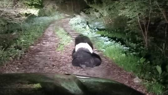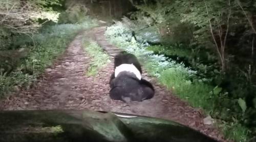 Очевидцы сделали фото. На кадрах видно, медведь все также с бидоном на голове лежал посередине дороги. Утверждается, что хищник был мертвым.
