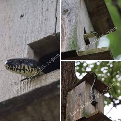 Очевидцы сделали фото. Как оказалось, в скворечнике на дереве спряталась небольшая змея. Она выглядывала из домика и, скорее всего, раздумывала, что делать дальше. А дальше просто выползла из него и скрылась.