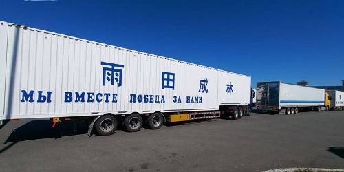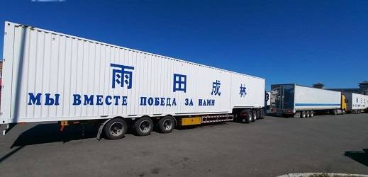 На одном из пунктов пропуска в очереди стоят фуры. Именно на них нанесена надпись. На китайском и русском языках написано: «Мы вместе победа за нами».