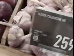 Покупатели в магазине назвали это «метаморфозами». Происходящее сняли на видео. Как оказалось, на ценнике большими цифрами указана цена - 259.90 за килограмм чеснока, который привезен из Узбекистана. Однако после того, как покупатель взвешивает товар, на чеке указана совсем другая цена - 599.90 все за тот же килограмм.