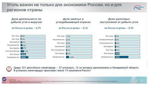 Есть отдельные регионы в стране, угольная отрасль в которых является определяющей. В первую очередь это Кузбасс. Здесь угольщики - ключевые налогоплательщики и работодатели. Так почти каждый 10-й моногород России угольный, а каждый второй угольный моногород – находится в Кузбассе. И эти моногорода живут и развиваются, потому что их продукция востребована и в России, и на мировых рынках.
