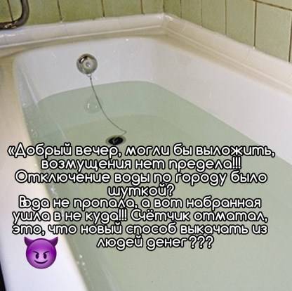 В Сети она уточнила, что ее возмущению нет предела, и описала ситуацию. Оказалось, что объявление о том, что на какое-то время отключат воду, послужило толчком к тому, чтобы набрать воду в емкости. Но, как оказалось позднее, воду не отключали. А вот избавиться от набранной - стала растратной статьей бюджета. Так как теперь счетчик намотает то, что было непредвиденно.