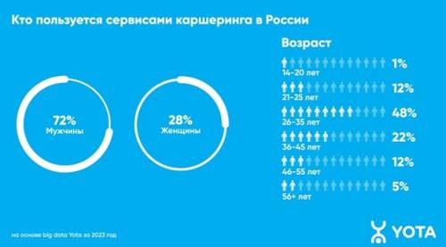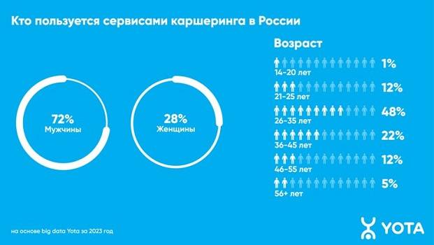 Большинство пользователей каршеринговых сервисов — мужчины (72% аудитории). Однако именно женская аудитория обеспечила основной прирост интернет-трафика таких приложений в 2023 году (+16%).