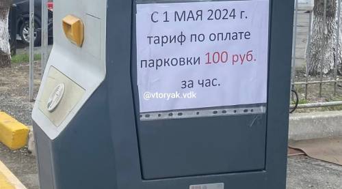 Повышение планируется с 1 мая. Стоимость парковки одного автомобиля в час будт стоить 100 рублей. Об этом свидетельствует объявление на платежном терминале.