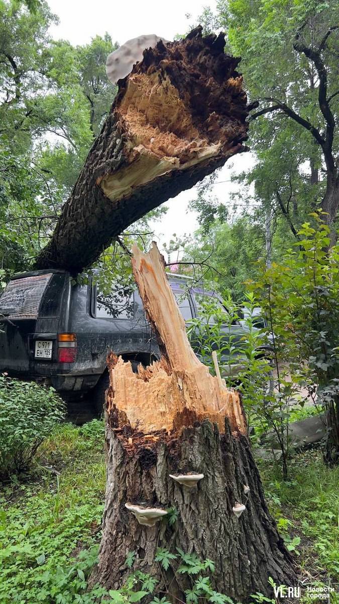 Пострадали два внедорожника: Isuzu Bighorn и Toyota Land Cruiser Prado. К счастью, пишет vl.ru, людей рядом не было. Судя по стволу, дерево просто сгнило.