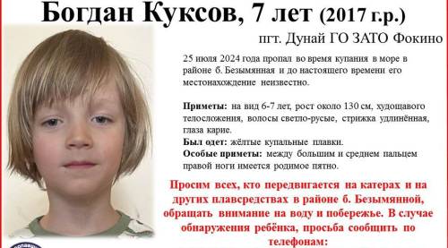 Наапомним, 7-летний Богдан Куксов пропал во время отдыха с семьей в районе бухты Безымянная в поселке Дунай.