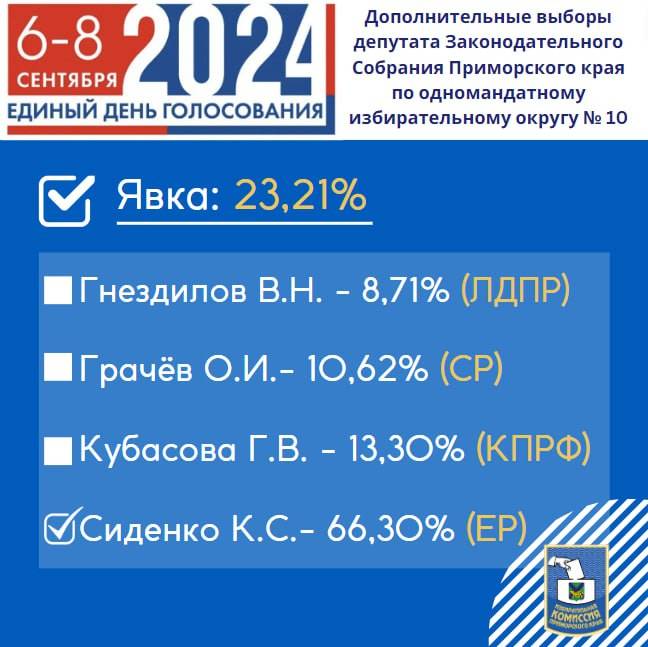 Быший командующий Тихоокеанским флотом Константин Сиденко побеждает на дополнительных выборах депутата Законодательного собрания Приморья по одномандатному округу № 10, - сообщает "Вести: Приморье" со ссылкой на Избирком Приморья.
