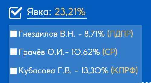 Второе место у представителя КПРФ Галины Кубасовой (13,3%), на третьем - справедливоросс Олег Грачёв (10,62%), представитель ЛДПР Вячеслав Гнездилов набрал всего 8,71% голосов.