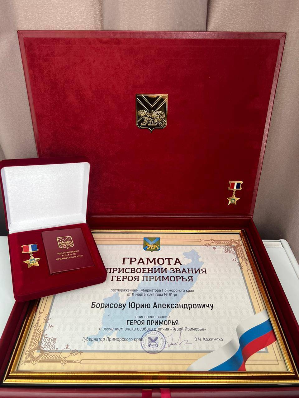 20 октября 2024 года состоялось торжественное награждение Знаком особого отличия «Герой Приморья». Как сообщае "Вести: Приморье", распоряжением губернатора Приморского края от 11.03.2024 г. за заслуги перед государством, связанные с совершением геройского подвига в ходе СВО, знак особого отличия «Герой Приморья» присужден гвардии майору, заместителю командира батальона по вооружению 155-й отдельной ордена Жукова гвардейской бригады морской пехоты ТОФ Юрию Александровичу Борисову (19.03.1987-26.04.2022). За многочисленные подвиги он также награжден орденом Мужества и медалью “За отвагу”.