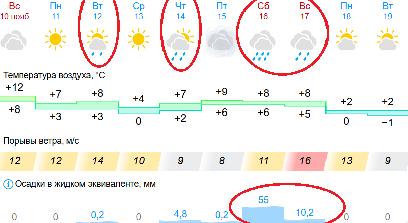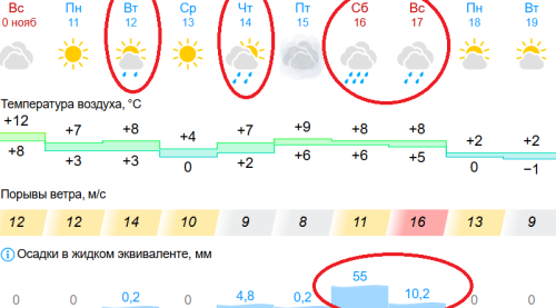 Кроме того дожди вероятны в предстоящий вторник, 12-го, и в четверг, 14 ноября.