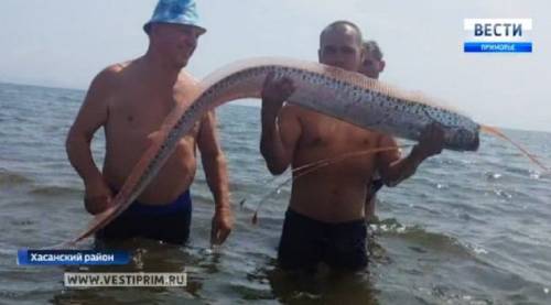 В российских водах впервые заметили сельдяного короля или ремень-рыбу. Рыбу обнаружили 5 августа в бухте Паллада в Приморье жители Хасанского района: ее сфотографировали, после чего отпустили.