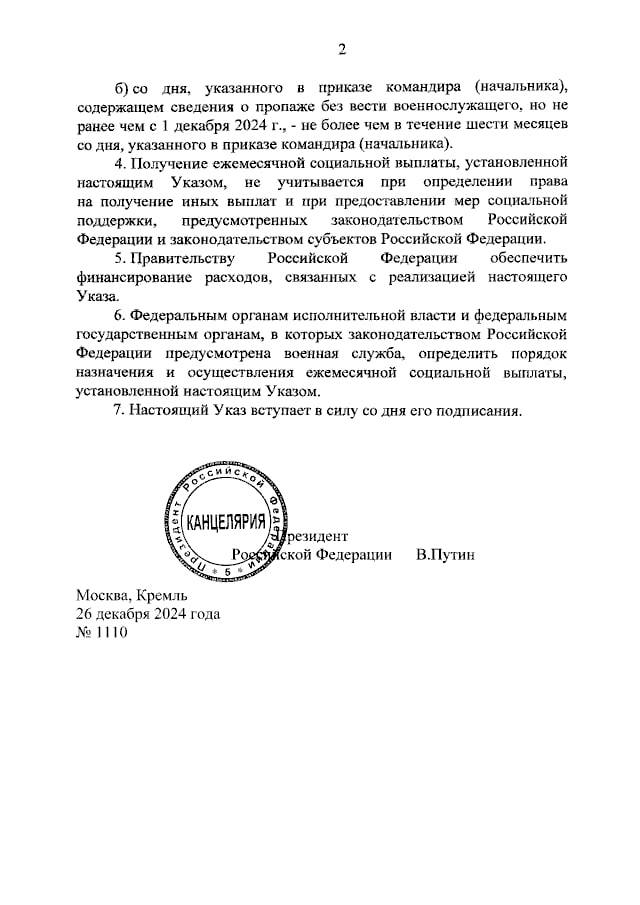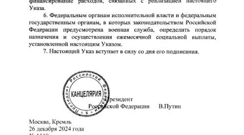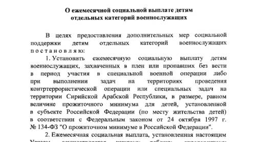 Президент России Владимир Путин подписал указ о ежемесячной социальной выплате детям военных, захваченных в плен или пропавших без вести, в том числе в период участия в СВО, - сообщает "Вести: Приморье".