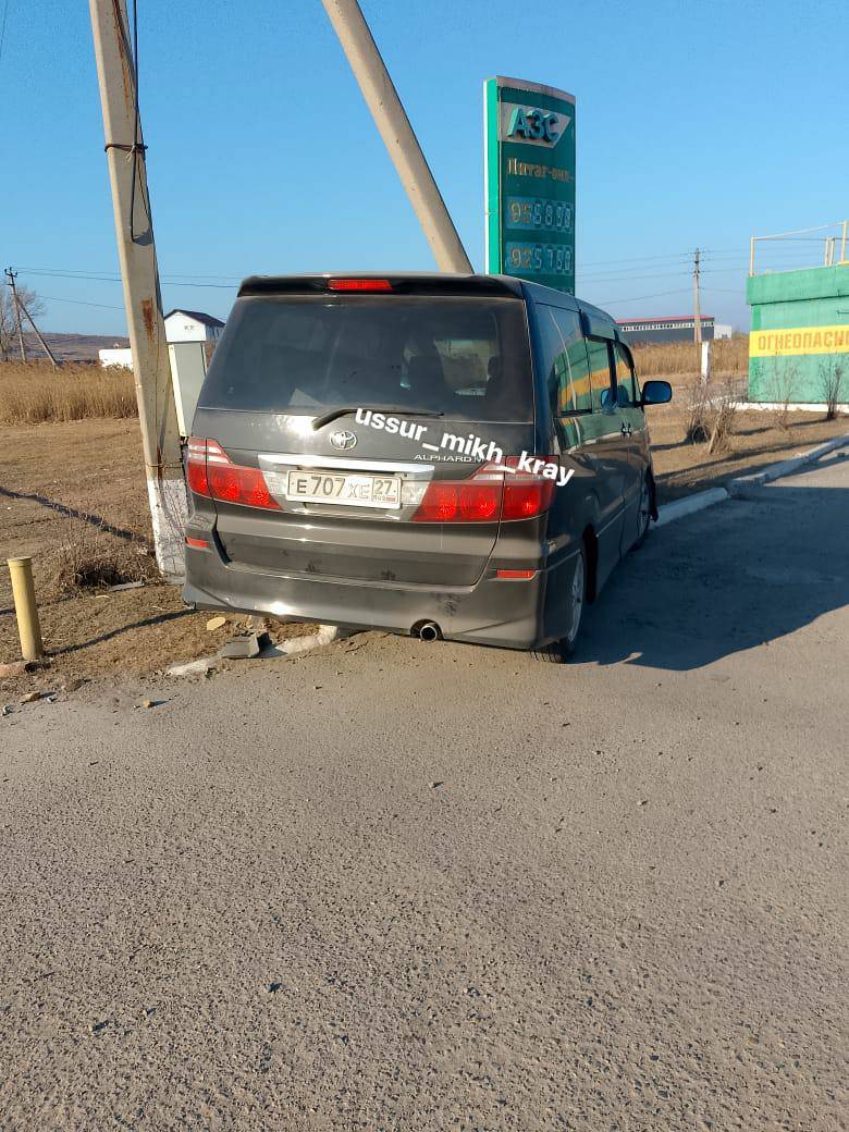 Так в Уссурийске на улице Фадеева на заправке произошло ДТП. Водитель заправил авто, но далеко не уехал, прямо на АЗС врезался в столб ЛЭП.