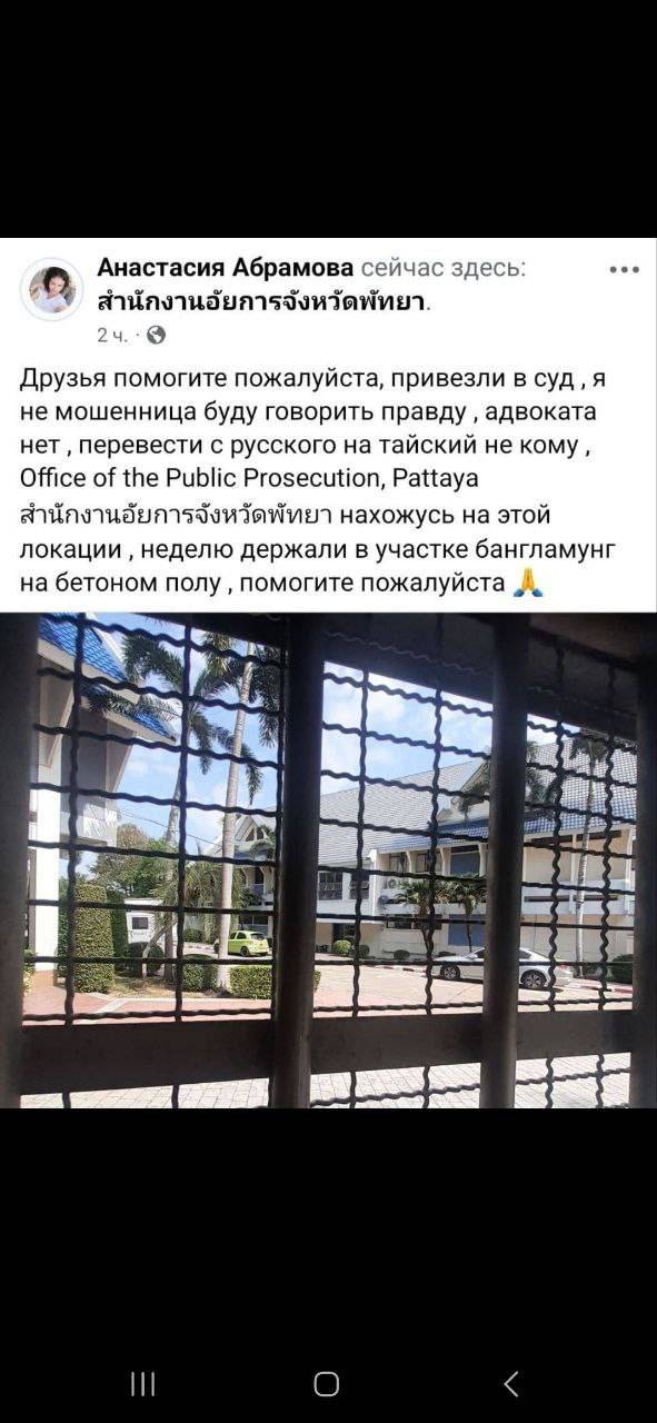 "Друзья, помогите, пожалуйста, привезли в суд, я - не мошенница, буду говорить правду, адвоката нет, перевести с русского на тайский некому. Неделю держали в участке бангламунг, на бетонном полу, помогите, пожалуйста", - написала Анастасия А. в социальной сети.