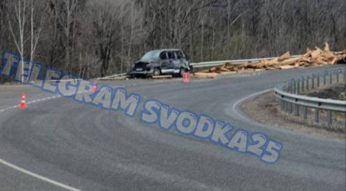 Фура с древесиной опрокинулась на трассе в Приморье: доски упали на микроавтобус